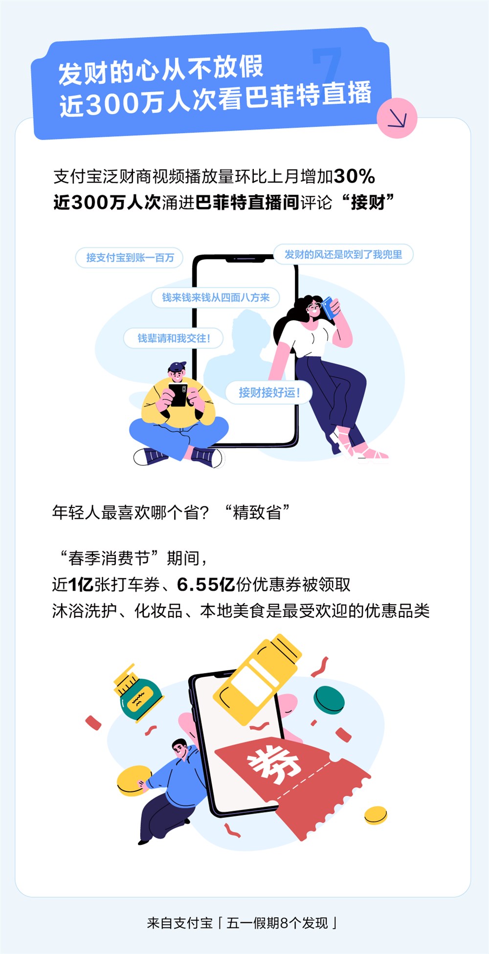 五一年轻人最喜欢哪个省?“精致省”。今年全国商家联合支付宝举办的“春季消费节”中,共有近1亿张打车券和6.5亿张优惠券被领取,其中沐浴洗护、化妆品、本地美食是最受欢迎的优惠品类,爱吃的人也是囤券的“神”,“先领券再买单”也成为年轻人践行理性消费的新趋势。